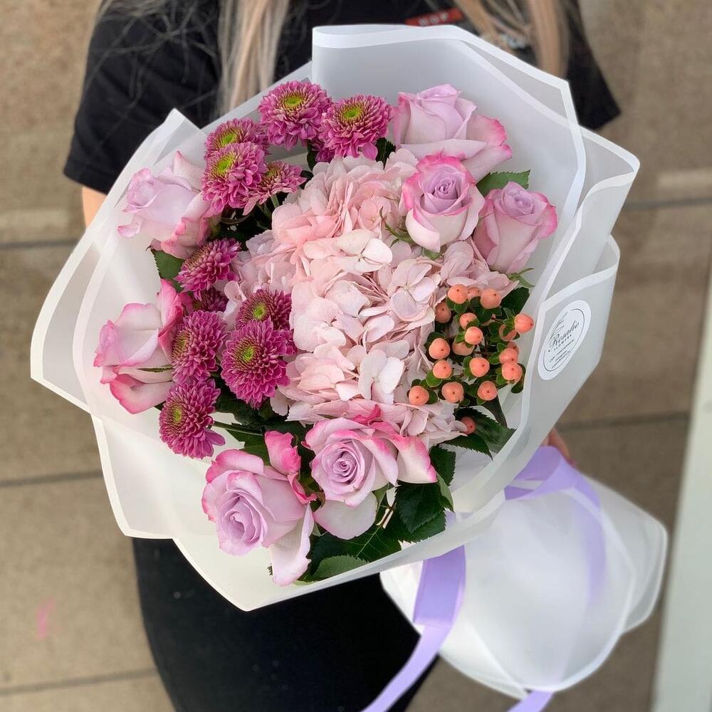 Гиперикум - 1 шт. Гортензия - 1 шт. Хризантема - 2 шт. Упаковка - 1 шт. Роза 40 см - 7 шт.